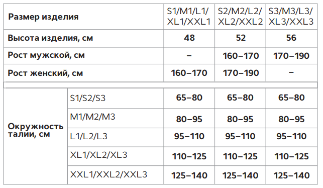 Для определения высоты изделия необходимо померьте высоту спины, измерив расстояние от C7 позвонка до L5 позвонка. Далее соотнесите рекомендованную высоту изделия и рост (мужской или женский). Полученный размер корректора (1, 2 или 3) соотнесите с окружностью талии, представленной в таблице.